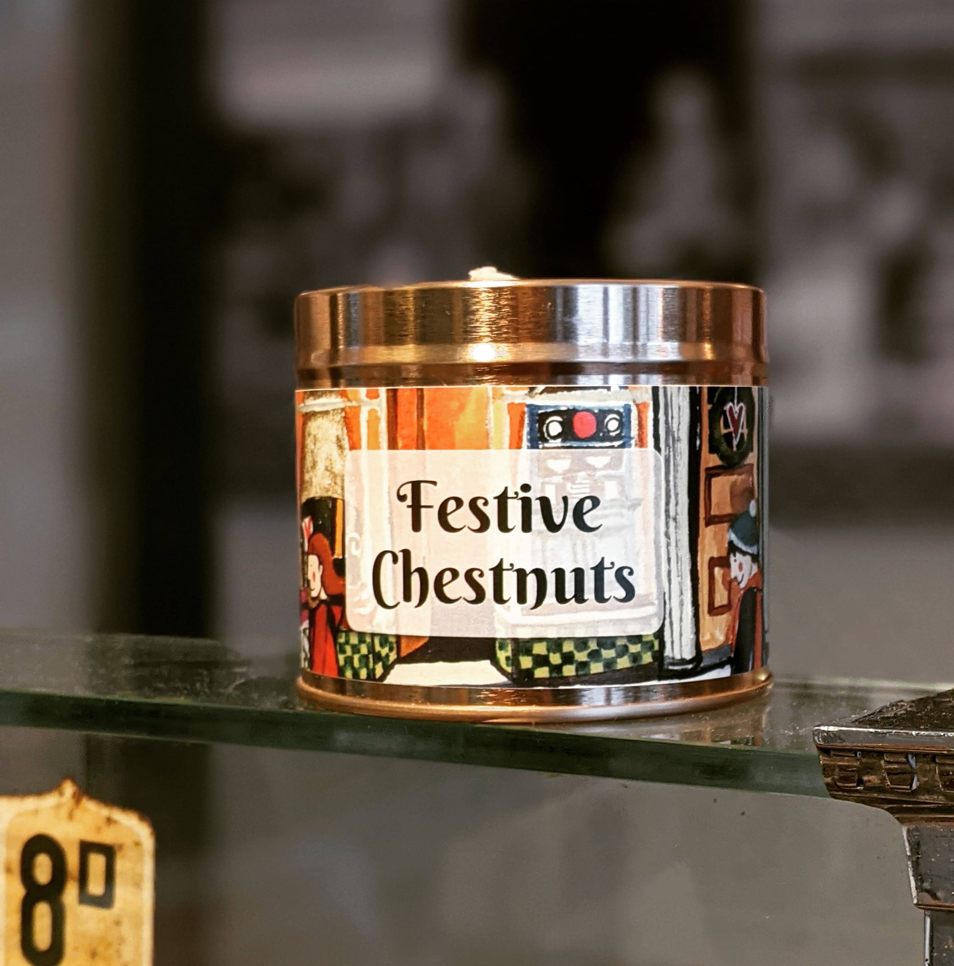 Exclusive! Featuring Christmas artwork of our shop by Lizzie Spikes, this warmly scented candle has blended the scents of Roasted Chestnuts and Warm Sugar to create an irresistible smelling candle!