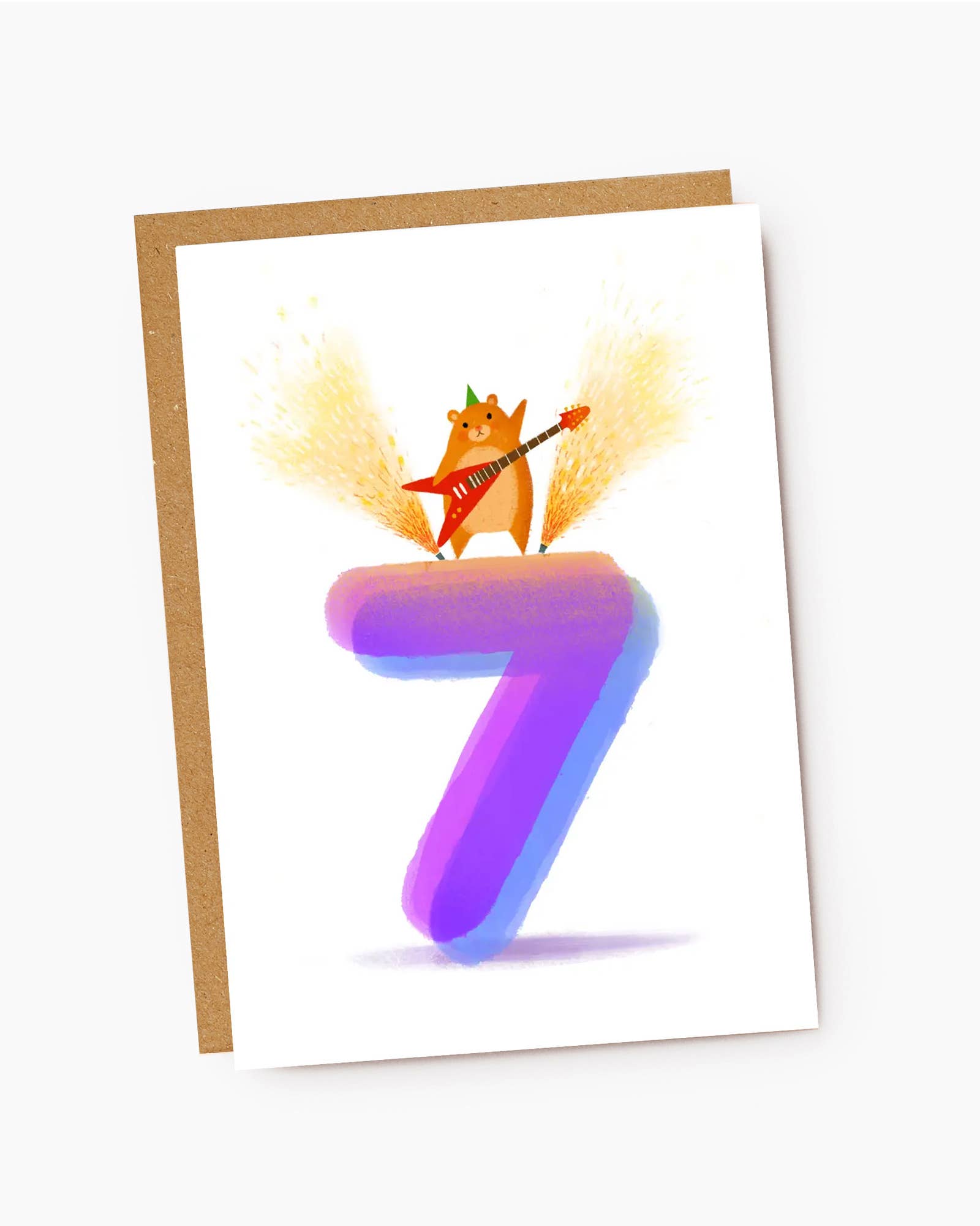 A cute rock star hamster with a colourful 7 for 7th birthdays, suitable for any kid celebrating turning 7. This is from our fun range of animal birthday cards for ages 1-9 designed by Jade's brother, Adam.